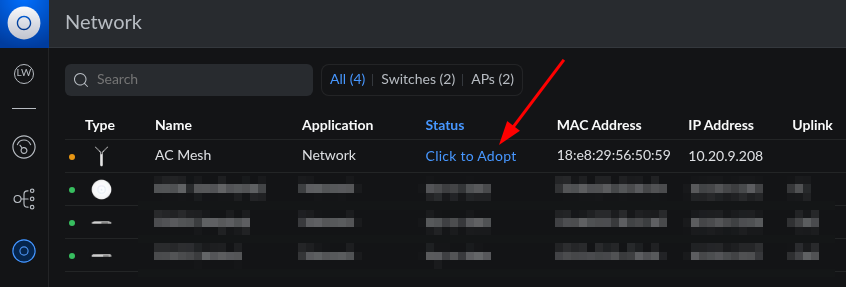 - Initiate Adoption in the UniFi Controller: Go to your UniFi Controller's web interface and open the site where you want to add the new UniFi device. Navigate to the 'Devices' section and look for your device listed as "Pending Adoption" or similar. Click 'Adopt' (or 'Click to Adopt').