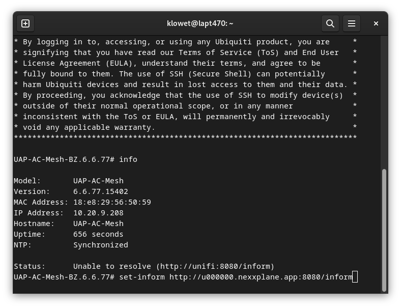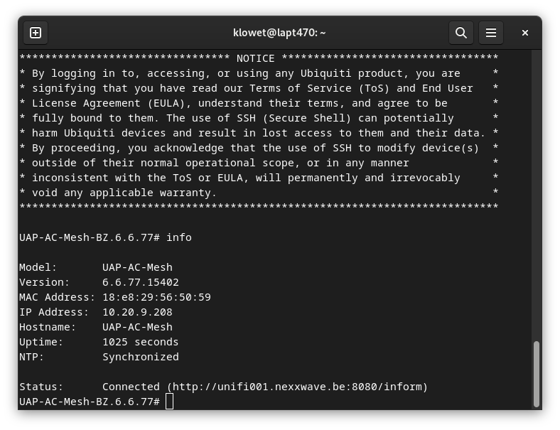 Congratulations! Your device is now ready for use. If you log into your UniFi device via SSH again and run the info command, you'll now see that its status is 'Connected'.