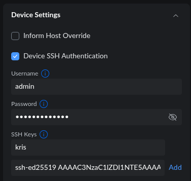 Your public SSH key will now be securely pushed to all UniFi devices within this site. Also, take note of the 'Username' displayed in this section (e.g., 'admin'). You'll need this username for SSH login.