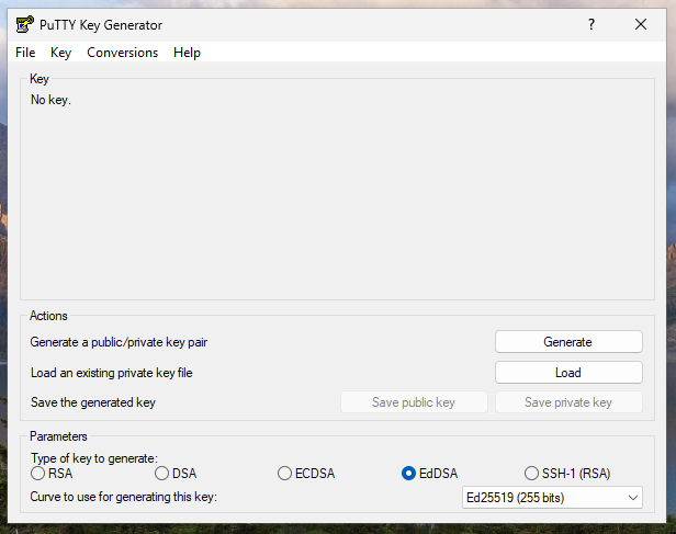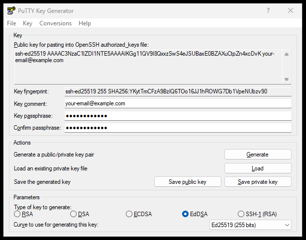 - At the bottom of the PuTTYgen window, select 'EdDSA' for the type of key to generate. For the 'Curve', choose 'Ed25519 (255 bits)'.