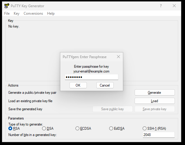 On Windows, we'll use PuTTYgen. This program is typically installed by default when you download and install PuTTY. Search for "PuTTYgen" in your Windows Start menu and launch it.