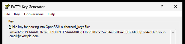 After generating your SSH key, you'll have two parts: the private key (saved to your computer) and the public key. On Linux, these are separate files. With PuTTYgen on Windows, the public key is displayed at the top of the PuTTYgen window immediately after generation.