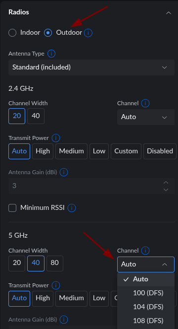For 'Outdoor' Access Points, there is often no alternative - again, depending on local regulations. It's common for outdoor mode to restrict channel selection to DFS channels only. You might think, "I'll just put my outdoor Access Points in 'Indoor' mode to circumvent this." Unfortunately, as the installer/administrator of the Wi-Fi network, you are responsible for its operation and must adhere to all local regulations. Attempting to bypass these regulations can lead to legal issues and interference with critical services.